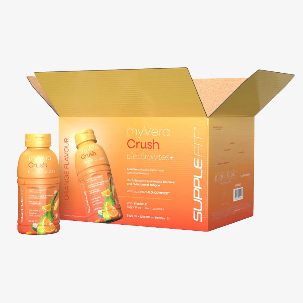 MYVERA CRUSH Electrolytes + ist ein Nahrungsergänzungsmittel auf Basis von Saft und Gel aus Aloe-Vera-Blättern sowie Vitamin C und Süßungsmitteln. Das Produkt zeichnet sich zusätzlich durch sein köstliches Orangenaroma aus. Dank der sorgfältig abgestimmten Kombination aus Aloe Vera und Vitamin C, die für ihre zahlreichen positiven Eigenschaften bekannt sind, wirkt der patentierte ALO-COMPLEX™ -Komplex entgiftend und antioxidativ auf den Körper.