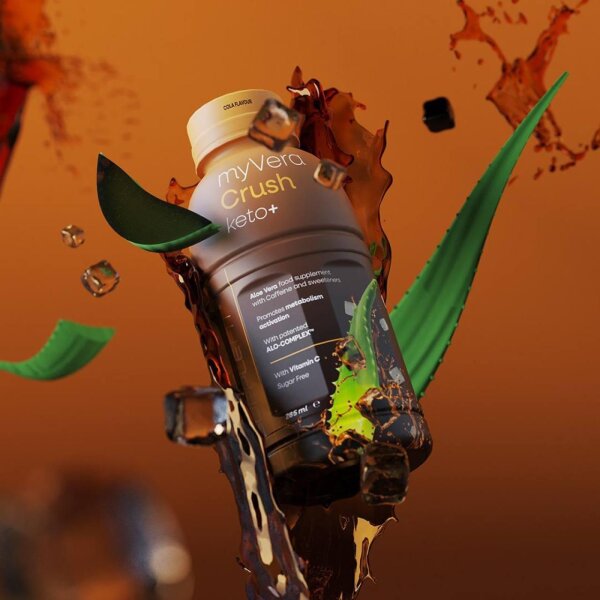 MYVERA CRUSH Keto + ist ein ketogenes Nahrungsergänzungsmittel mit Koffein und Süßungsmitteln, basierend auf Saft und Gel aus Aloe Vera Blättern sowie Vitamin C. Das Produkt zeichnet sich zusätzlich durch sein köstliches Cola-Aroma aus. Dank der sorgfältig abgestimmten Kombination aus Aloe Vera und Vitamin C, die sich durch zahlreiche positive Eigenschaften auszeichnen, wirkt der patentierte ALO-COMPLEX™ -Komplex entgiftend und antioxidativ auf den Körper.
